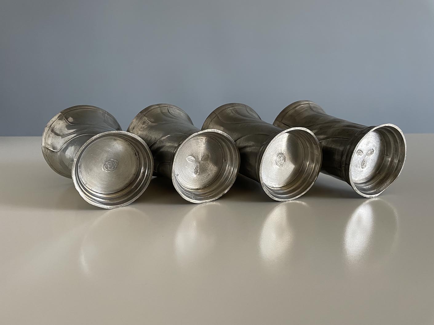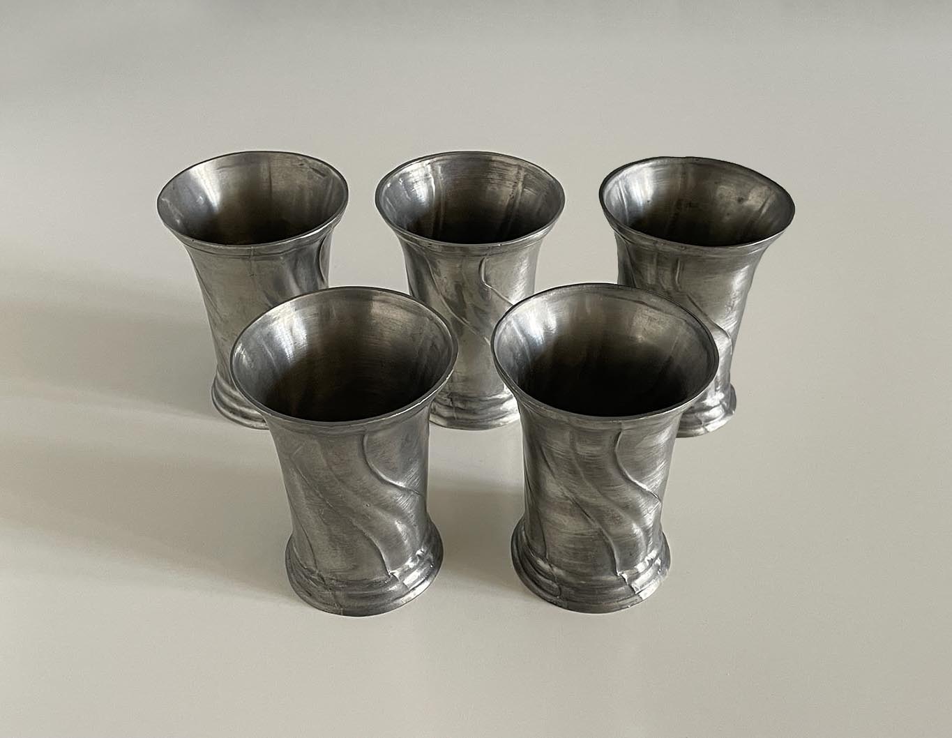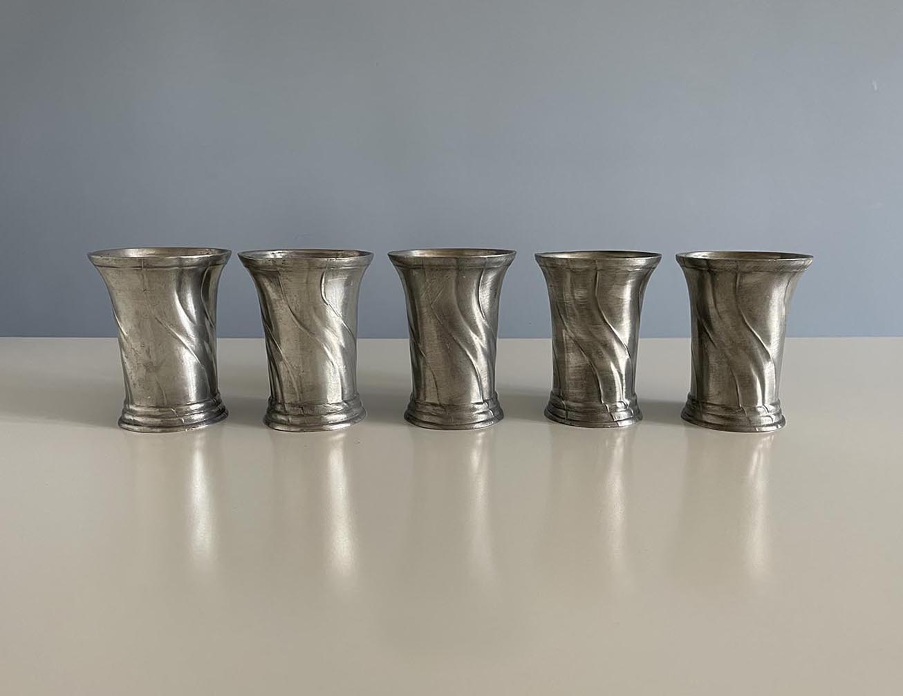 Nagyobb méretű, fodros díszű, ón pohár készlet (5 db)