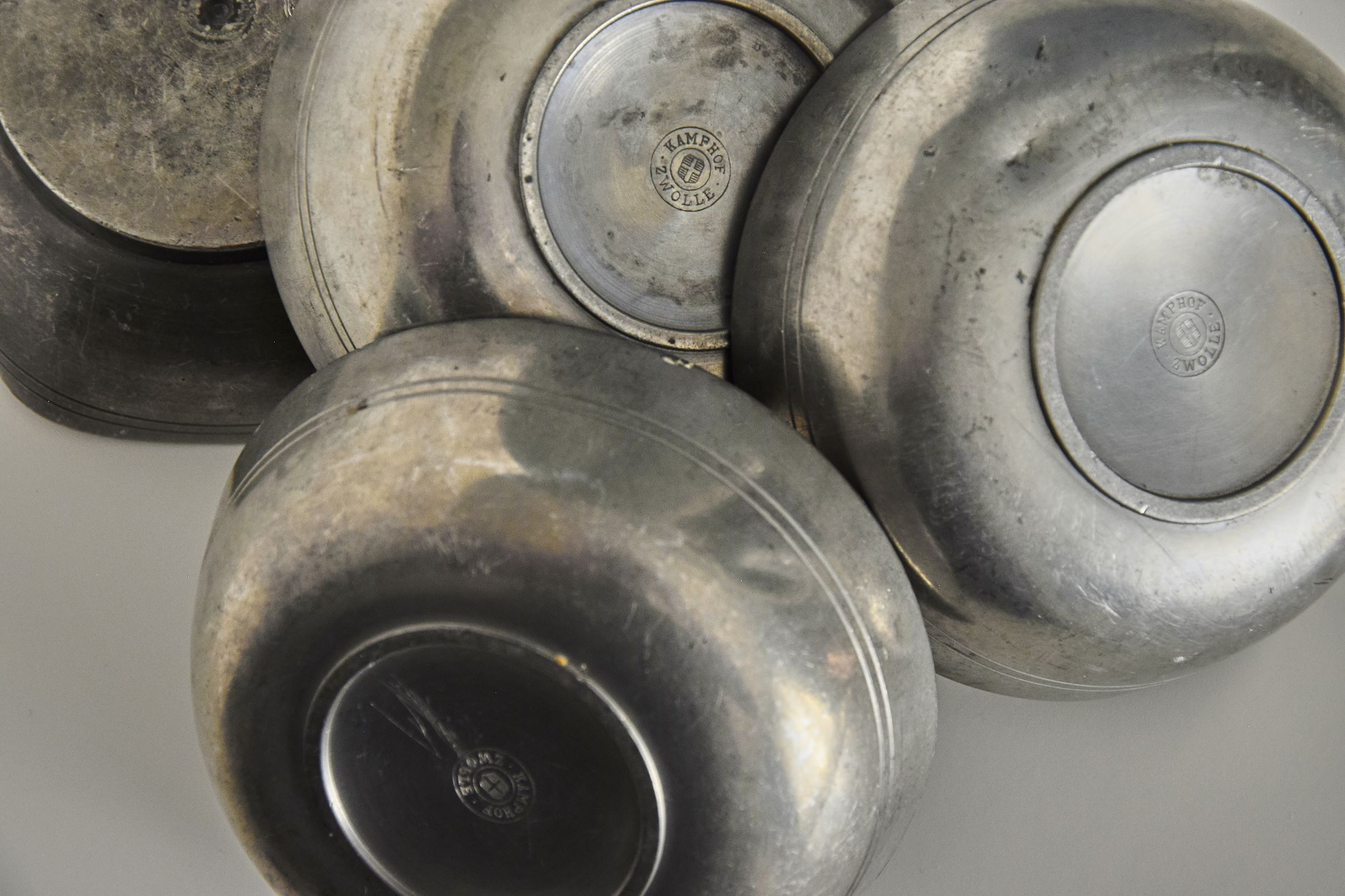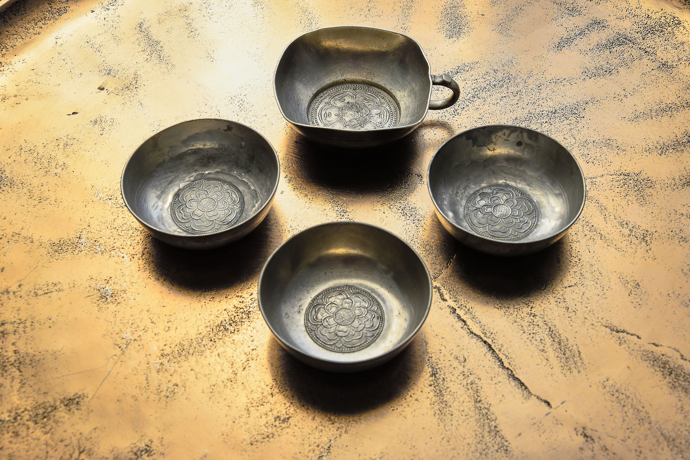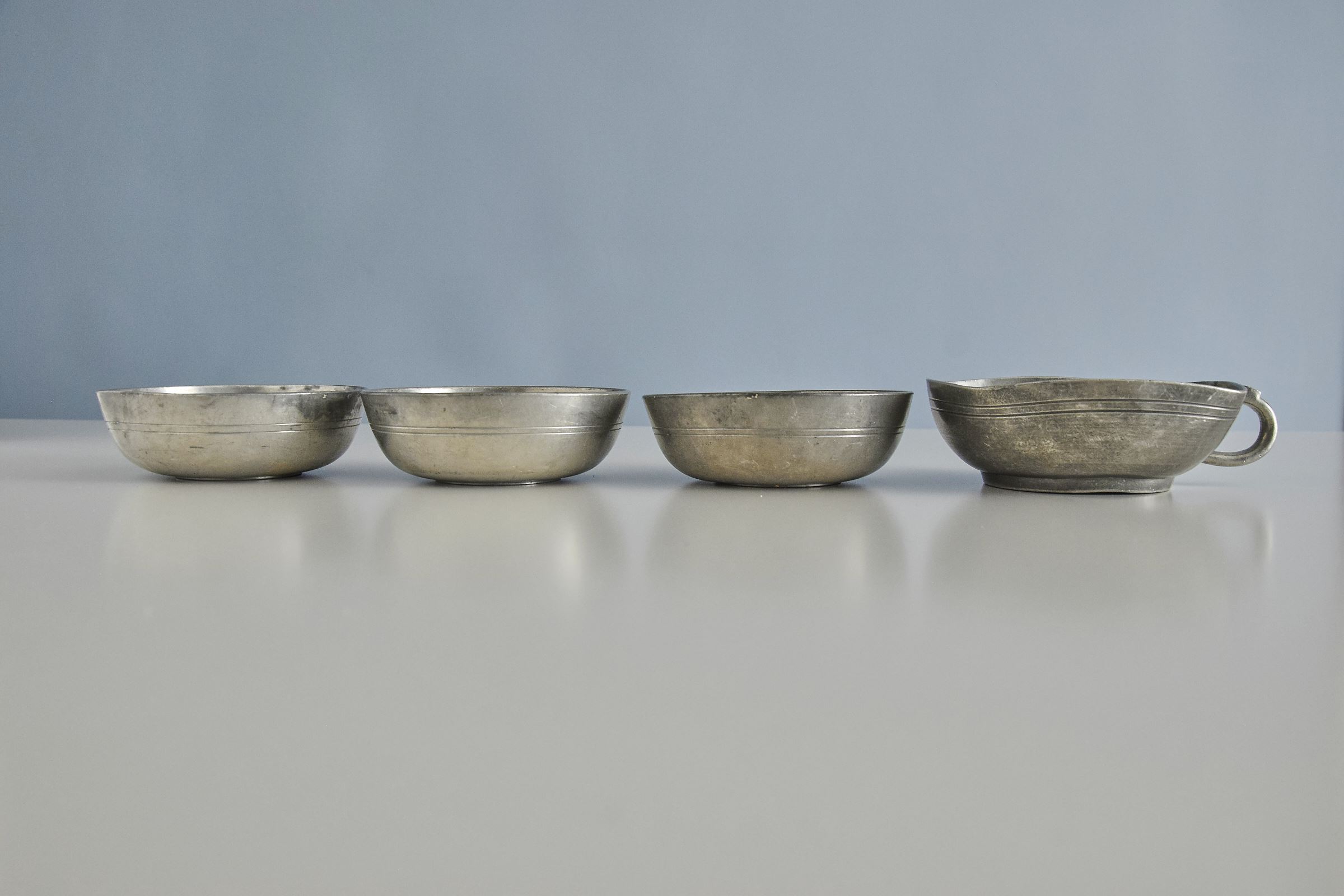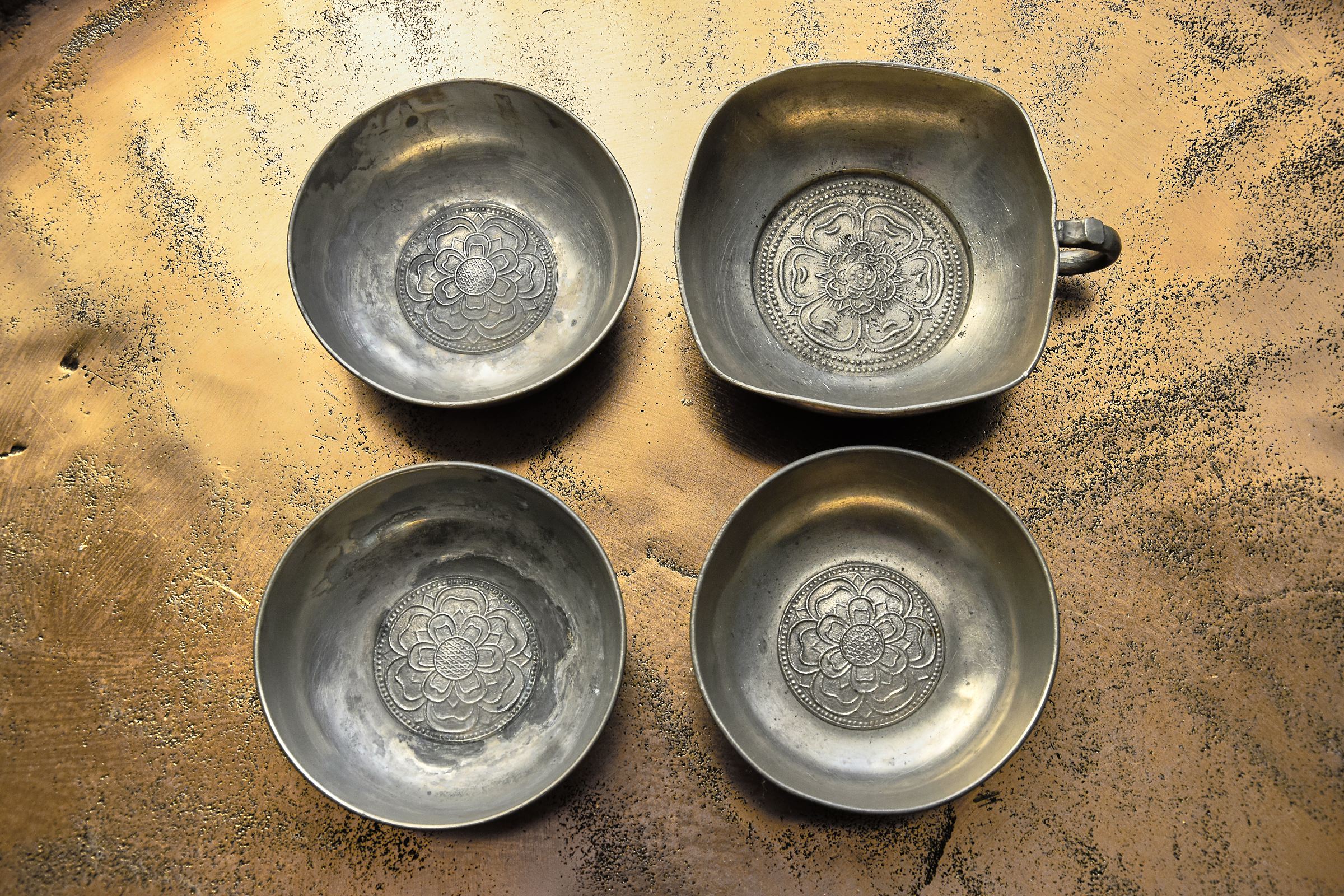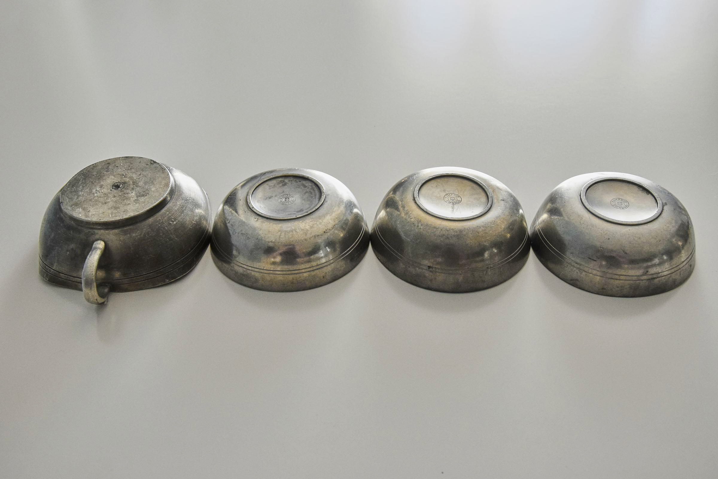 Egyszerűbb formájú, nagy, ón teáscsésze/tálka készlet (4 db)